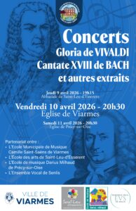 Le vendredi 10 avril, à 20h30, à l’église Saint-Pierre et Saint-Paul de Viarmes, l’Ecole Municipale de Musique Camille Saint-Saëns donnera un concert : Gloria de VIVALDI, Cantate XVIII de BACH et autres extraits.