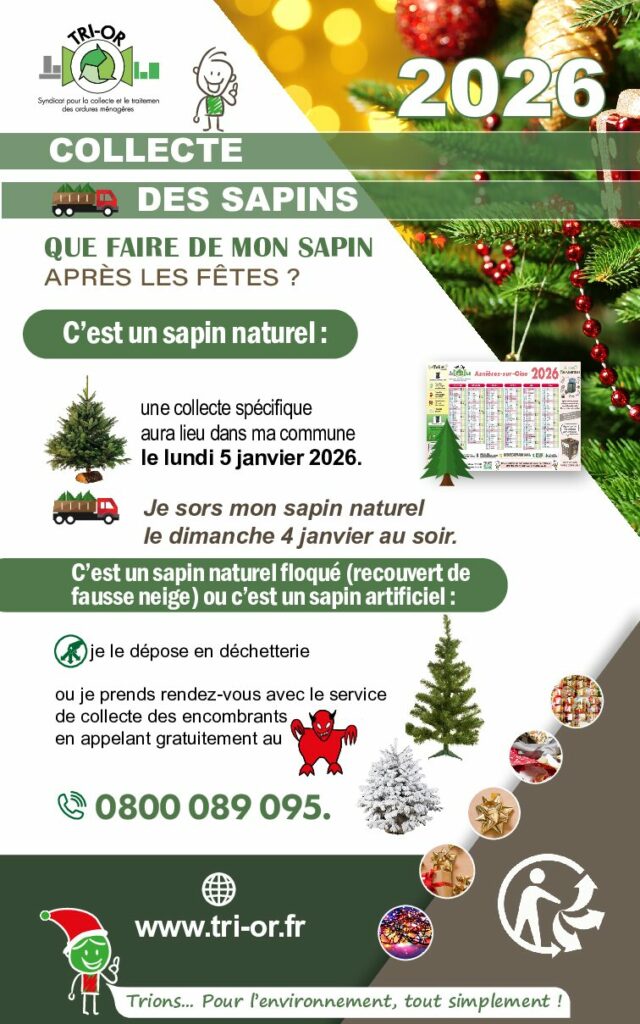 La collecte des sapins (non floqués) par le syndicat TRI-OR est programmée à Viarmes le lundi 5 janvier 2026. Les sapins sont à déposer sur les trottoirs dès le dimanche 4 janvier au soir. Les sapins floqués, eux, devront être déposés en déchetteries.