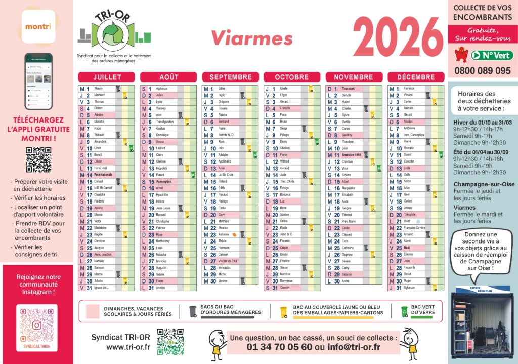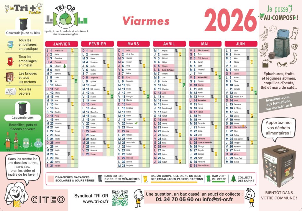 La collecte des sapins (non floqués) par le syndicat TRI-OR est programmée à Viarmes le lundi 5 janvier 2026. Les sapins sont à déposer sur les trottoirs dès le dimanche 4 janvier au soir. Les sapins floqués, eux, devront être déposés en déchetteries.