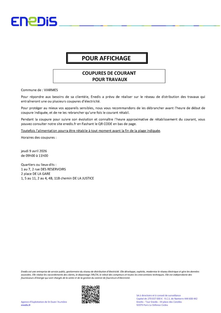 Le jeudi 9 avril 2026, de 09h00 à 11h00, Enedis a prévu de réaliser sur le réseau de distribution des travaux qui entraîneront une ou plusieurs coupures d’électricité.