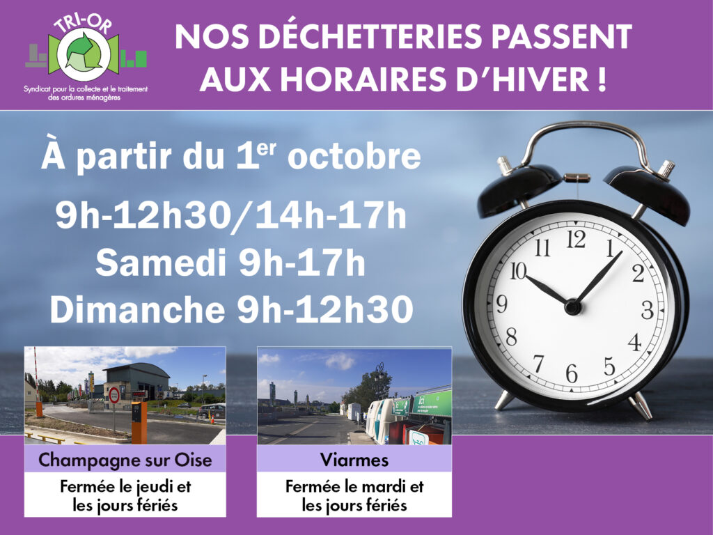 Les déchetteries du syndicat Tri-Or, en charge de la collecte et du traitement des ordures ménagères sur le territoire de Viarmes, passent en horaires d’hiver à partir du 1er octobre 2025 :