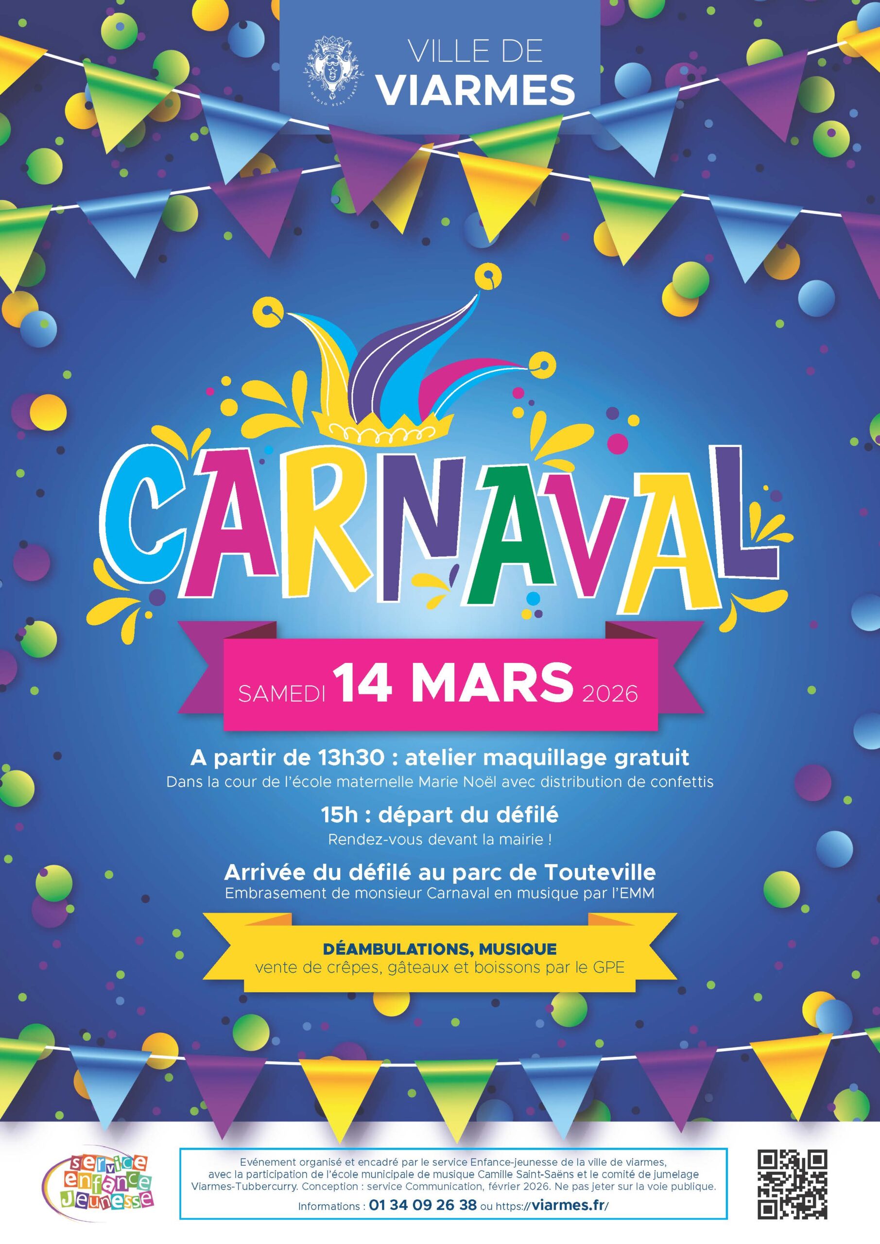 Le service Scolarité-Enfance-Jeunesse de la ville de Viarmes organise le samedi 14 mars 2026 dès 13h30 un grand carnaval pour les enfants, les jeunes et leurs parents. Artistes de rue, déambulations, vente de gâteaux et boissons… Venez nombreux !