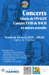 Le vendredi 10 avril, à 20h30, à l’église Saint-Pierre et Saint-Paul de Viarmes, l’Ecole Municipale de Musique Camille Saint-Saëns donnera un concert : Gloria de VIVALDI, Cantate XVIII de BACH et autres extraits.