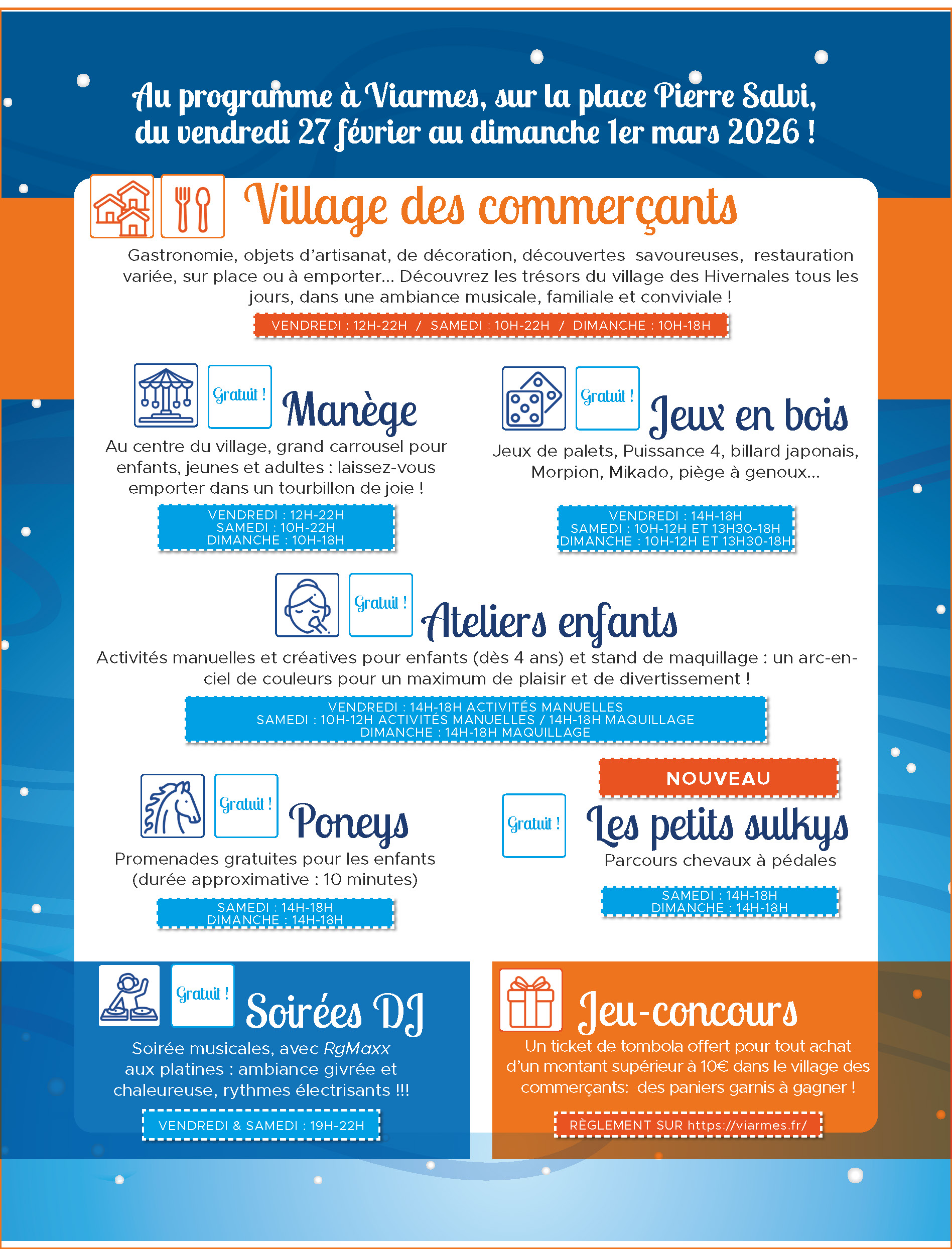 Carrousel, poneys, jeux, soirées DJ… Le village des Hivernales de Viarmes propose, chaque année en février, des animations gratuites et familiales, des jeux et évènements musicaux, durant 3 jours de festivités… Ne manquez pas cette occasion unique de vous amuser entre amis ou en famille ! Rendez-vous à Viarmes, les 21, 22 et 23 février 2025, sur la place Pierre Salvi. Demandez le programme !!!