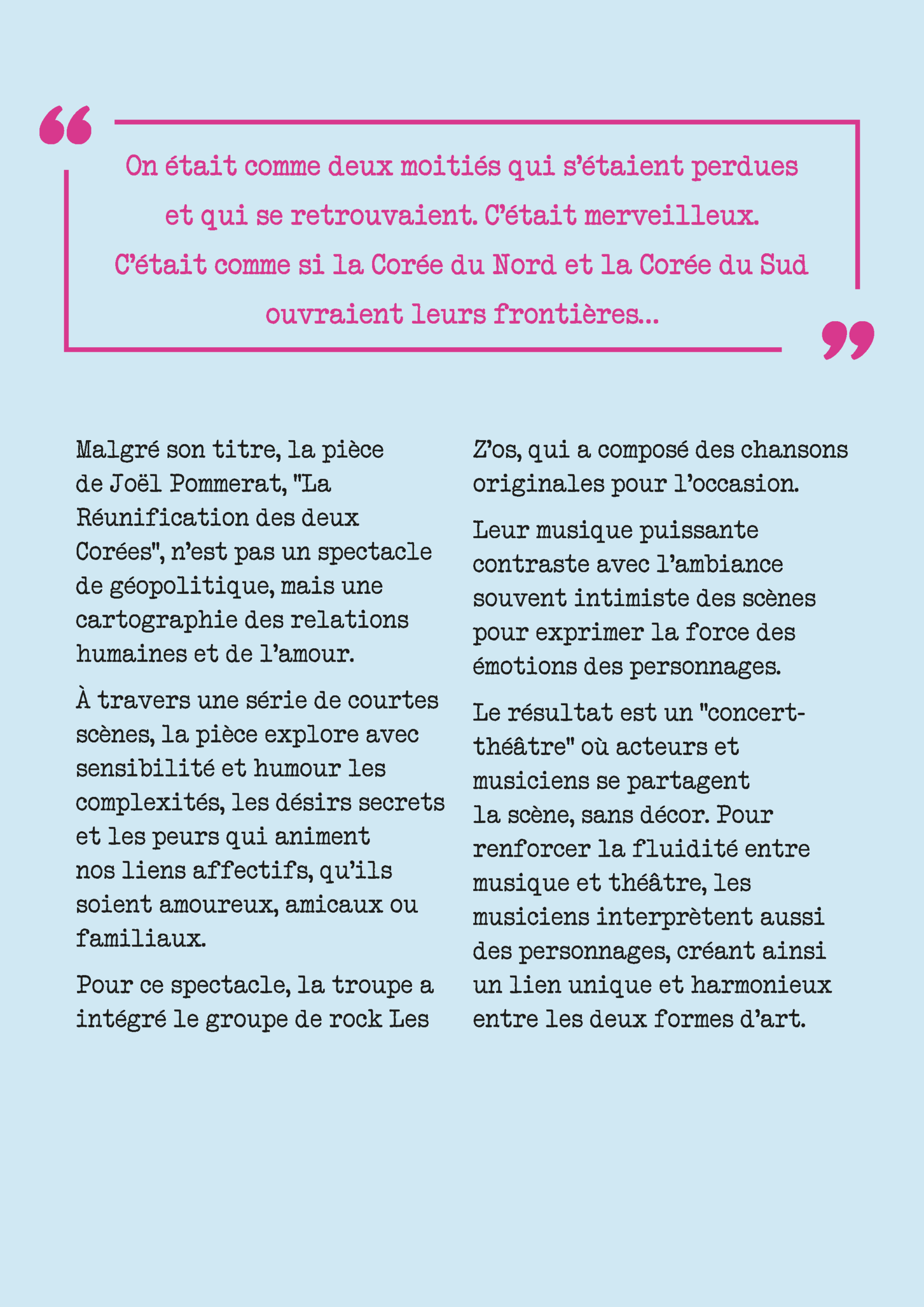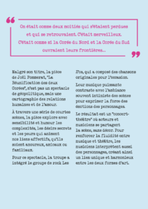 Le vendredi 8 novembre à 20h30, la troupe du Théâtre de l’Empreinte interprètera, à la Salle Saint-Louis, la pièce « La Réunification des deux Corées » de Joël Pommerat.