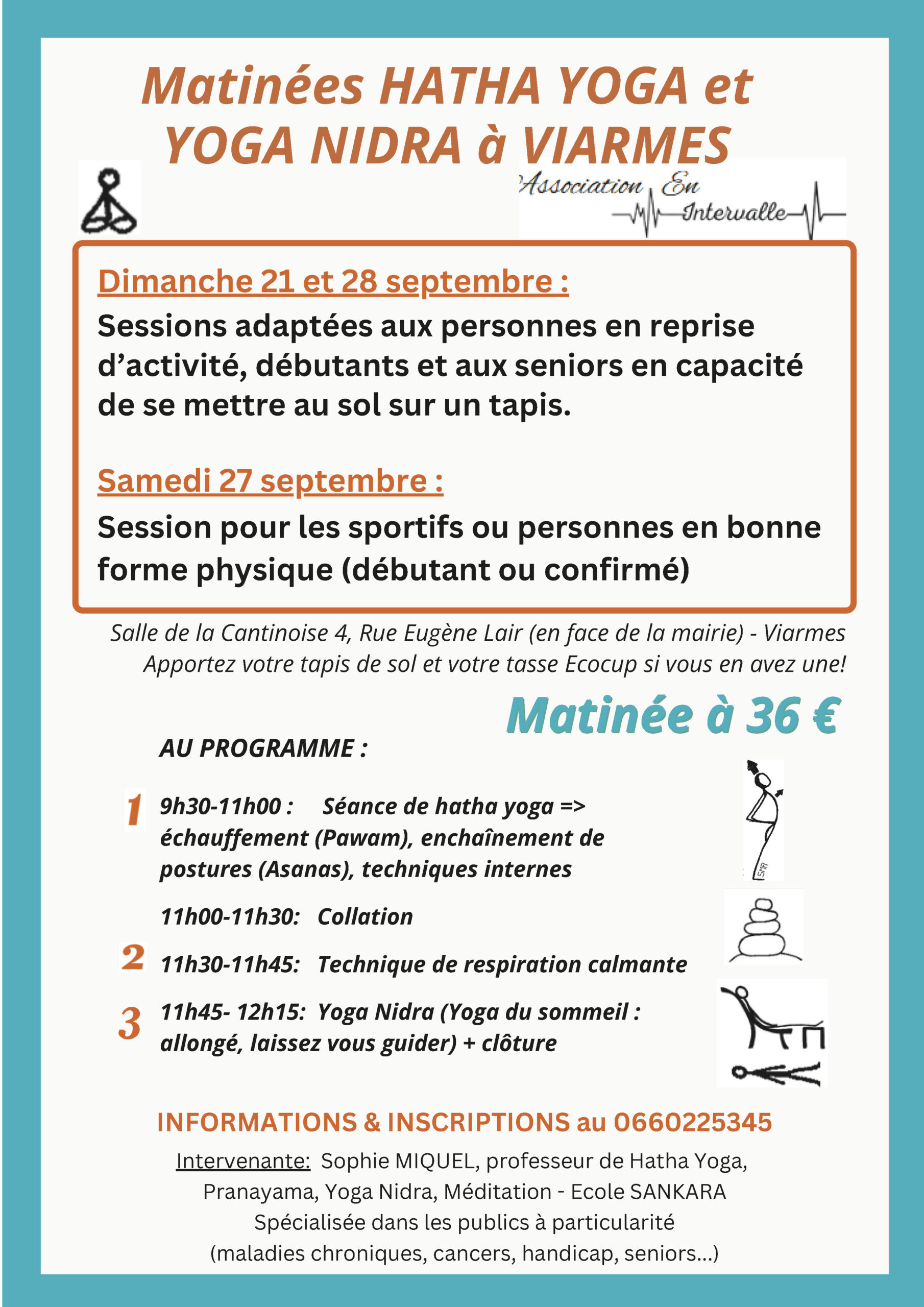 L’association « En intervalle » propose, le 27 septembre 2025 dès 9h30, une matinée de yoga tous niveaux, adaptée aux débutants et confirmés.